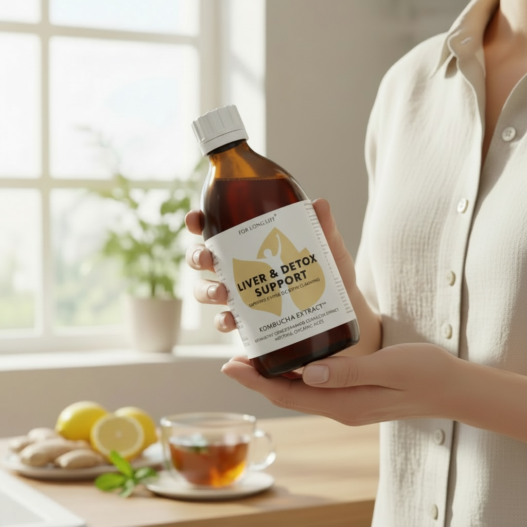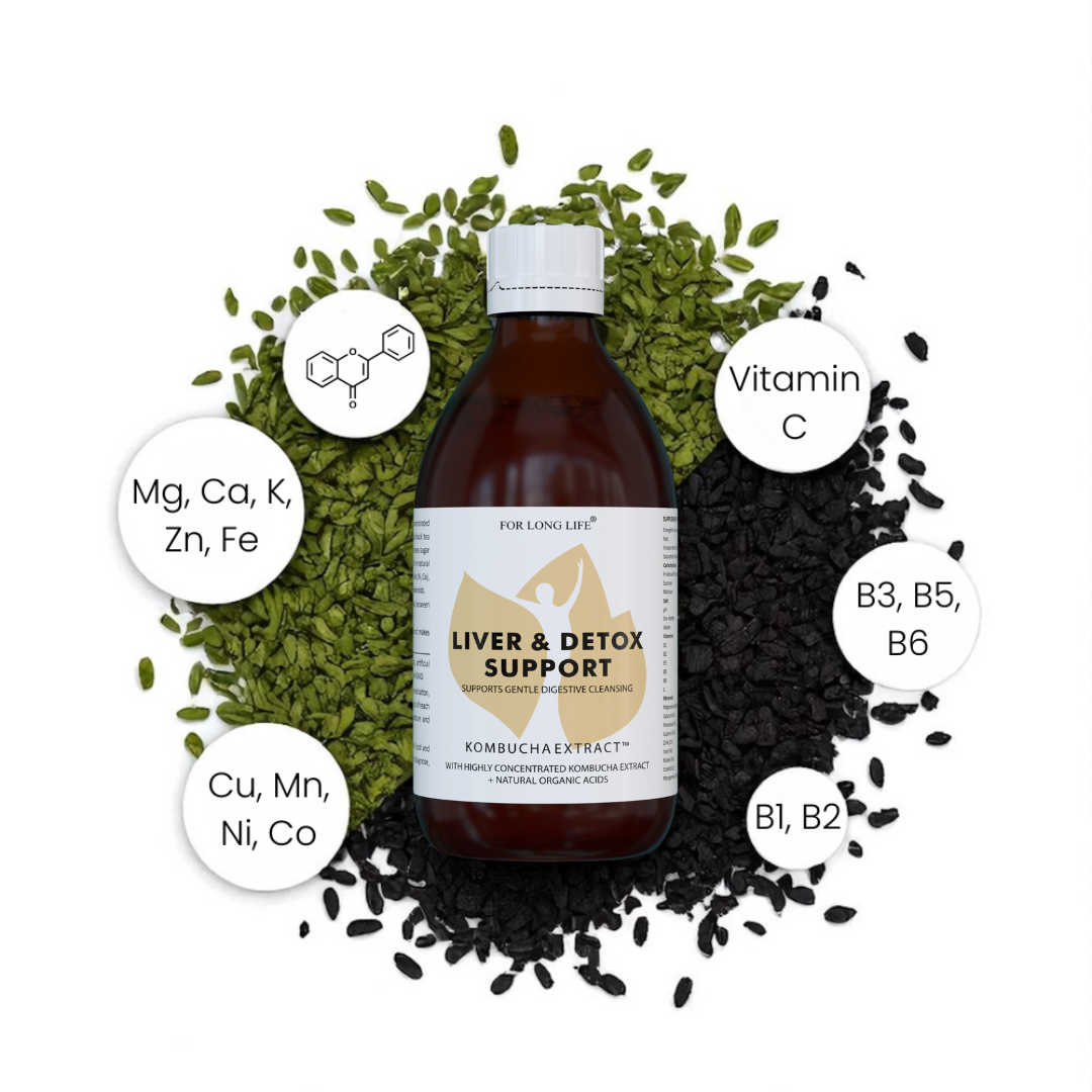 Kombucha has long been used in traditional medicine for its liver-cleansing and vitality-enhancing properties. Through a patented vacuum separation process, For Long Life concentrates kombucha tea into a highly bioavailable extract while removing sugar and alcohol. This preserves high levels of glucuronic acid—a key compound in phase II liver detoxification—alongside polyphenols, B vitamins, and trace minerals. These compounds contribute to detoxifying harmful substances, supporting metabolic pathways, regulating lipid and glucose metabolism, and enhancing the body’s antioxidant defenses. The antimicrobial and anti-inflammatory actions of kombucha components may also support immune and cardiovascular health, backed by growing research into its protective biological effects.